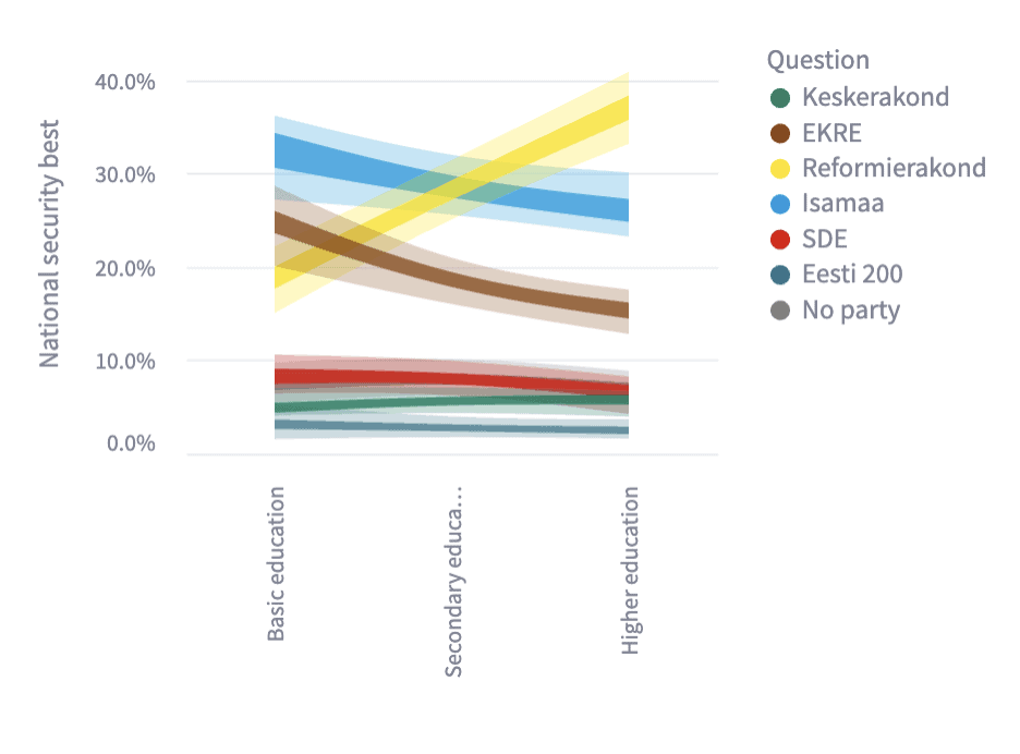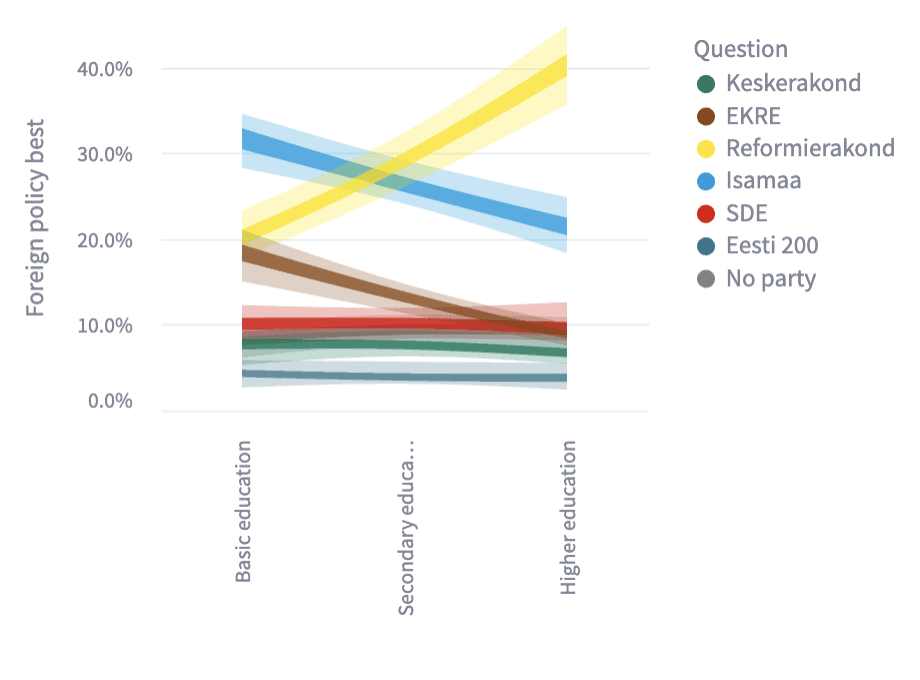 Toodud graafikutel on julgeoleku- ja välispoliitikavaldkonna kompetents kodanike haridustaseme järgi. Isamaa edestab julgeolekuvaldkonnas Reformierakonda ainult põhiharidusega vastajate seas ja välispoliitika küsimuses jääb alla ka keskharidusega inimeste seas.