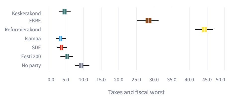 Uurisime märtsi esimeses pooles nähtust, mida ingliskeelses kirjanduses nimetatakse issue ownershipiks (erakondade usutavus ja kompetentsus erinevates poliitikavaldkondades). Iga valdkonna juures sai valida kõigi parlamendierakondade vahel ja lisaks kahele kompetentsele sai märkida ka ühe kõige ebakompetentsema erakonna. Inimeste pahameel Reformierakonna suunal väljendub eelkõige kõiges makse ja majandust puudutavas – pea 45% valimist märkis kõige halvemaks maksude küsimuses just Reformierakonna:
