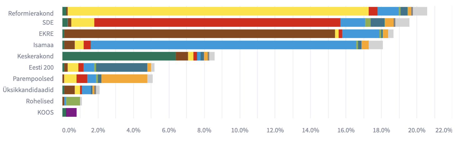 Isamaa paistab aga ise olevat mitme reitingufirma järgi juba mõnda aega languses ja nende tipp on möödas (nii Emor kui Turu-uuringud näitavad neile varasema 27% asemel 22% toetust). Ka meie märtsikuises uuringus oli ta veel 27% peal, nüüd mais 23% – olles küll jätkuvalt kõige populaarsem erakond, aga see ei paista hästi kanduvat EP tulemusse. Isamaal on küll natuke veel aega oma potentsiaalseid toetajaid teiste nimekirjade juurest enda juurde tuua, kuid meie värskes maikuu küsitluses (ainult veebis, 855 eelistusega EP valijat) kaotavad nad suurematest erakondadest kõige rohkem teistele (graafikul on EP nimekiri värvitud Riigikogu eelistuse küsimuse järgi, st on näha, millised EP nimekirjad kellelt juurde võtavad – nt meie küsitluses võtab Isamaalt juurde kõige rohkem EKRE):