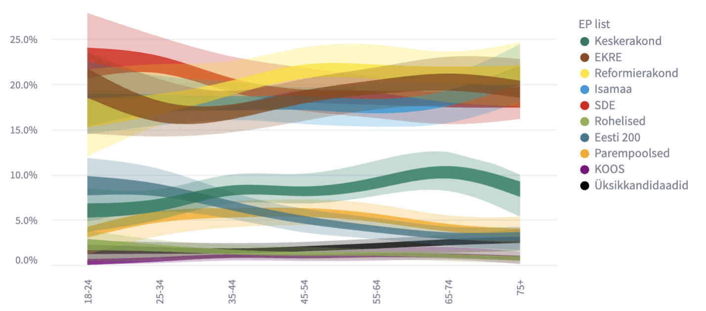 Siin ja järgneva juures on nüüd oluline rääkida sellest, kuidas täpselt me selle tulemuse kokku panime. Üleval oli juttu sellest, et EP valimistel osaleb küllalt väike grupp inimesi. Veel enam kui Riigikogu valimistel kipuvad Euroopa Parlamenti valima minema pigem haritumad, jõukamad ja vanemad inimesed, ühtlasi on muust rahvusest inimeste osalus veelgi madalam. Püüdsime sellest teadmisest lähtuvalt mudeldada 2023 Riigikogu valimiste tegelike tulemuste järgi eri valimispiirkondade rahvastikujaotusi arvesse võttes seda, millised parameetrid valimisaktiivsust ennustasid ja võimendasime nende efekti EP valimisteks veelgi, nagu teaduskirjandus EP valimisosalusest näitab. Tulemuseks saame, et EP valijaskonnast ligi 50% saab olema kõrgharitud ja alla 8% põhiharidusega, sellal kui valimisõiguslike kodanike seas on kõrgharitute osakaal umbes 30% ja põhiharitud 18%. Just need parameetrid kipuvad enim aitama Reformierakonda ja liberaalseid erakondi üldiselt, sest kõrgharitud inimeste seas on nii RE kui SDE Isamaast ees. Reformierakond on lisaks kaugelt kõige edukam jõukamate inimeste seas, sellal kui SDE nõrkuseks on suurem toetuse osakaal just nooremates gruppides.
