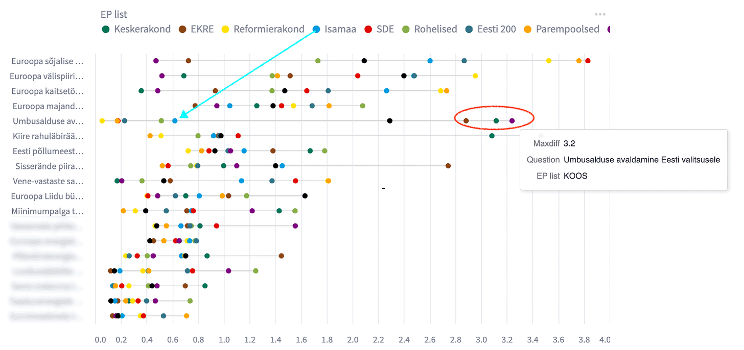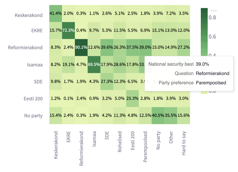 Nende graafikute juures tasub silmas pidada paari asja. Esiteks alahindab see ülimalt tõenäoliselt KOOSi valijate hulka – sedasorti veebi-küsitluses nagu meie tegime on vastavat gruppi erakordselt raske kätte saada, küllap on vene valija hääl neil valimistel siiski veidi tugevam. Teiseks, veebivalimid kipuvad üldiselt EKREt üle hindama, nii et EKRE reiting on väga tõenäoliselt 3-4% punkti ülehinnatud (see valim sattus meil veel erakordselt EKRE-sõbralik, aga pigem võiks uskuda teisi uuringuid, kus nende toetus märgatavalt madalam).