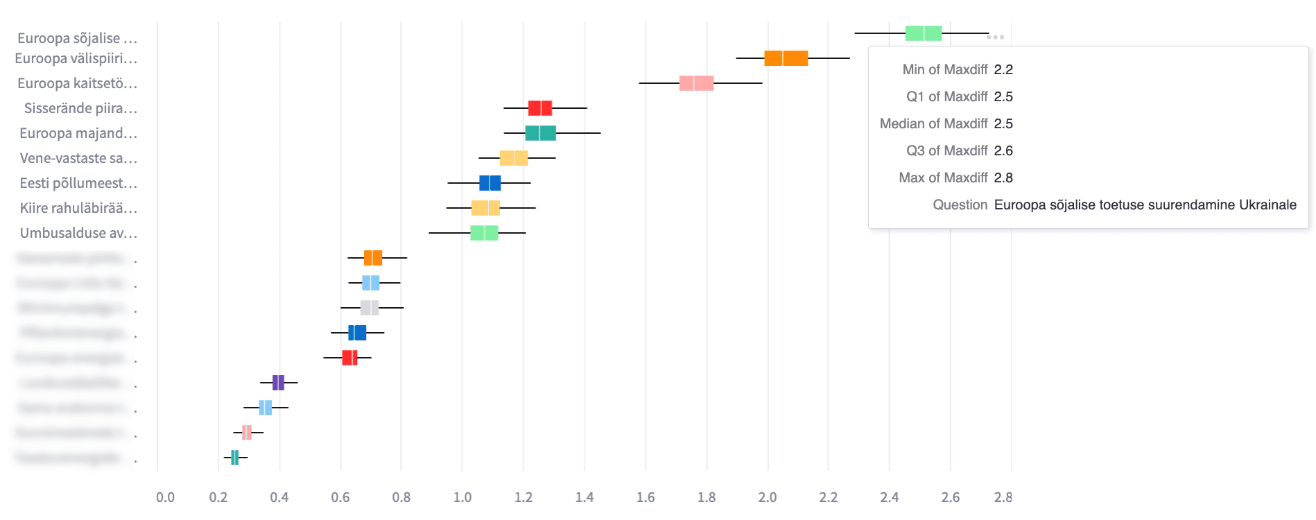 Testisime seekord 18 valimisteemat/motiivi üksteise vastu ja esikolmik ei jäta mingit kahtlust – EP valimistel tõenäoliselt osalevate valijate teemade tugevusjärjekord on sõjalise toetuse suurendamine Ukrainale, välispiiride kaitse, kaitsetööstuse võimekuse tõstmine, millele järgneb jupp tühja maad ja alles seejärel tulevad muud teemad nagu EKRE leivanumber sisserände piiramine Euroopasse, majanduse konkurentsivõime jne. [Märkuseks: nt keskmine number 2,5 tähendab siin ja järgnevalt valimisteemade juures kordajat, mitu korda tõenäolisemalt juhuvalikust vastajad selle valiku tegid]